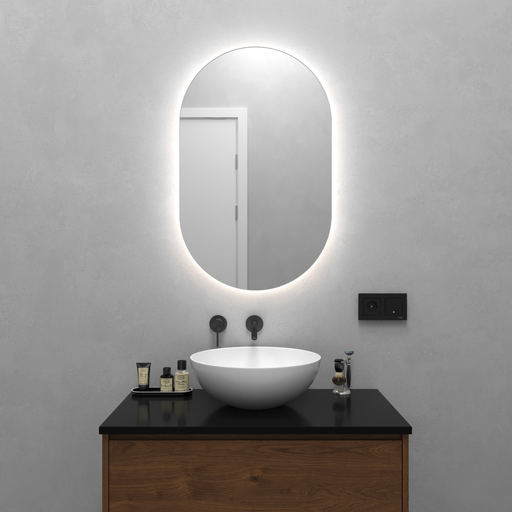 Безрамное зеркало овальной (капсульной) формы с контурной (тыльной) нейтральной подсветкой, свет 4000К. Подложка из высококачественного МДФ, светодиодная лента защищена матовым свето-рассеивателем от попадания пыли и влаги. Есть вывод 220W для подключения к сети, включение подсветки от выключателя на стене, либо от розетки.